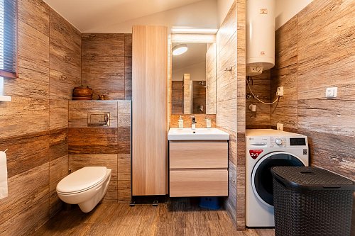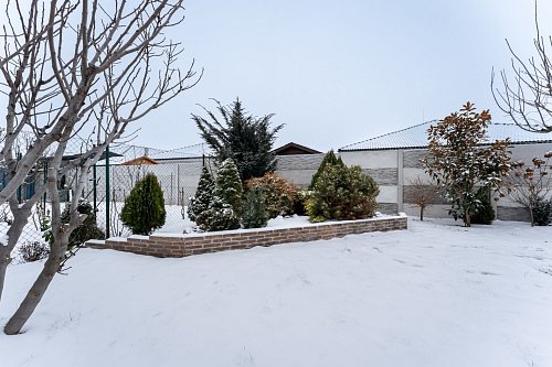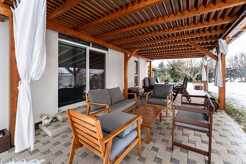 Z obývacej izby a jednej spálne je východ na priestrannú krytú terasu, kde si môžete vychutnať pokojné chvíle. Okolie domu je vkusne upravené zeleňou, ktorá dotvára príjemnú atmosféru pobytu na terase. Vedľa domu stojí montovaná garáž, ktorá okrem úložného priestoru obsahuje aj kuchynský kútik a toaletu.